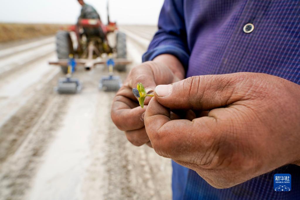 新疆尉犁縣巴西買(mǎi)里村,爾肯·熱衣木查看棉花嫩芽生長(cháng)情況(4月21日攝)。
