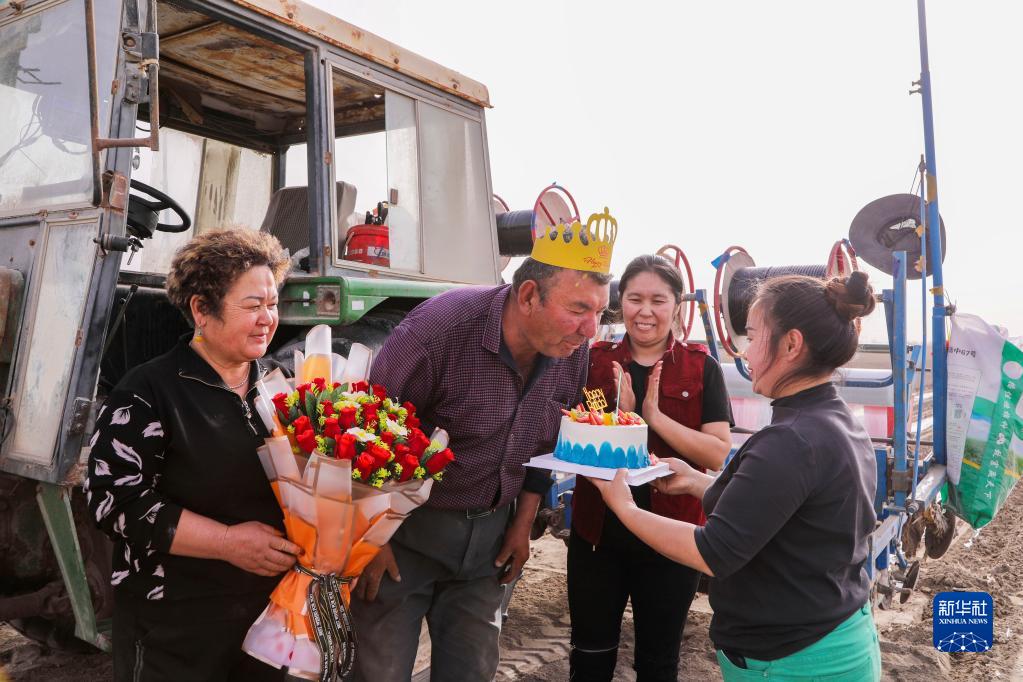 新疆尉犁縣巴西買(mǎi)里村,爾肯·熱衣木(左二)和家人一起在棉田里過(guò)生日(4月17日攝)。