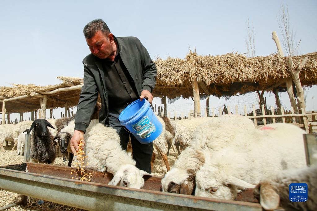 新疆尉犁縣巴西買(mǎi)里村,爾肯·熱衣木給羊喂食(3月29日攝)。