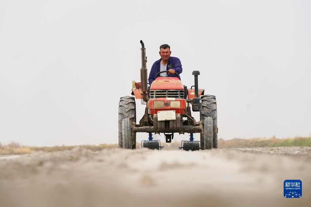 新疆尉犁縣巴西買(mǎi)里村,爾肯·熱衣木駕駛拖拉機在棉田里工作(4月22日攝)。拖拉機后面掛著(zhù)松土設備,通過(guò)碾壓和震動(dòng),讓雨后板結的泥土松動(dòng),有助于棉花嫩芽順利鉆出地膜。