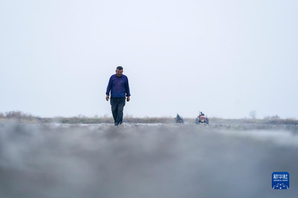 新疆尉犁縣巴西買(mǎi)里村,爾肯·熱衣木走在棉田里查看棉花嫩芽生長(cháng)情況(4月21日攝)。