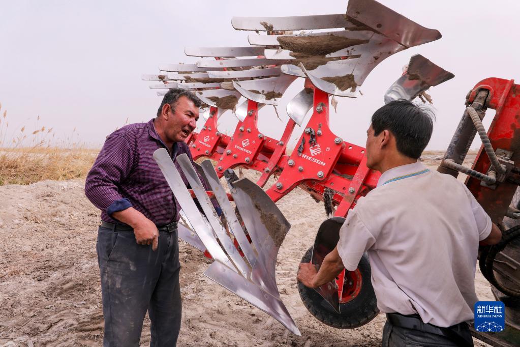 新疆尉犁縣巴西買(mǎi)里村,爾肯·熱衣木(左)檢查犁地用的工具(4月17日攝)。