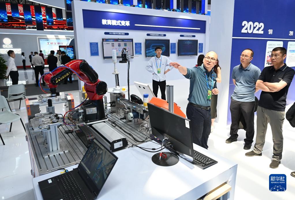 4月27日,在第六屆數字中國建設成果展覽會(huì )上,工作人員向參觀(guān)者介紹工業(yè)機器人應用編程一體化創(chuàng )新實(shí)訓平臺。