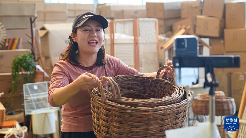 4月26日,臨沭縣歐拉工藝品有限公司員工通過(guò)電商銷(xiāo)售柳編制品。