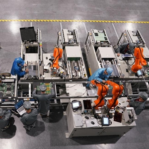 4月27日,在位于浙江杭州市蕭山區的紫光股份信息通信產(chǎn)品未來(lái)工廠(chǎng),技術(shù)人員調試生產(chǎn)線(xiàn)設備。