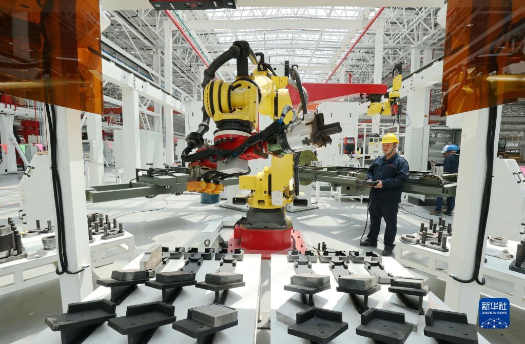4月27日,在位于浙江湖州市吳興高新區的浙江三一裝載機智能制造基地,工人在調試智能化生產(chǎn)線(xiàn)。