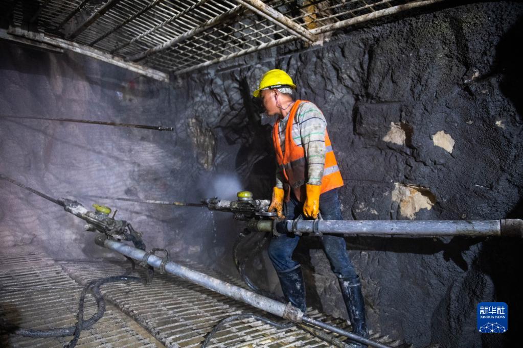 4月27日,在湖南桑龍高速賀龍隧道,工人做爆破施工前的準備工作。