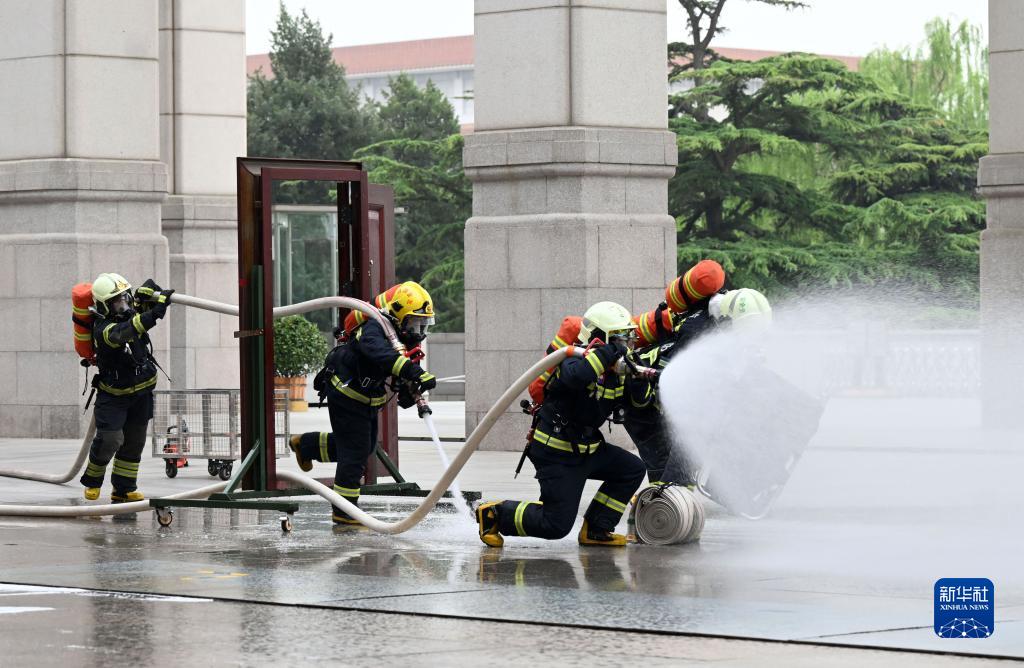 4月27日,消防隊員進(jìn)行滅火演練。