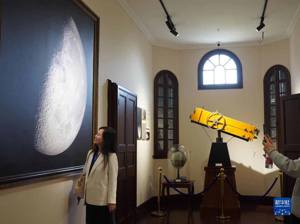 4月27日,觀(guān)眾在40厘米口徑大雙筒折射望遠鏡1901年拍攝的月球表面照片前留影。