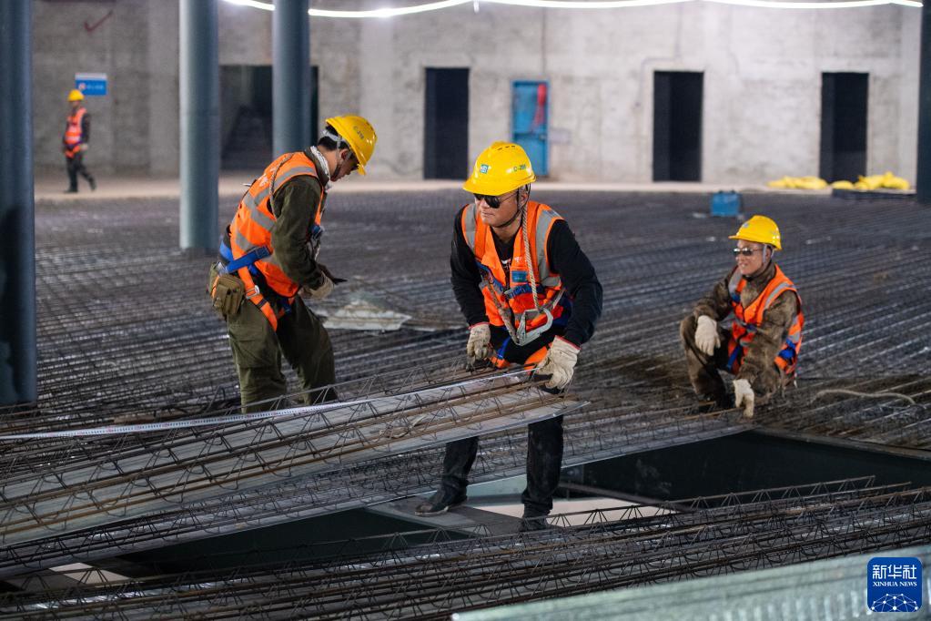 4月28日,在郴州市文體中心建設工地,中建五局裝飾公司工人在擺放鋼結構桁架樓層板。