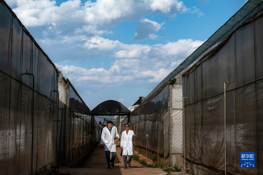 云南錦科花卉工程研究中心技術(shù)人員在討論工作(4月3日攝)。