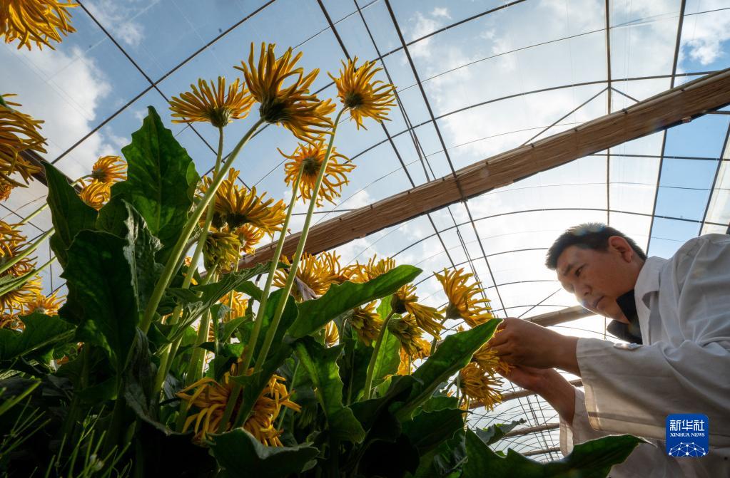 云南錦科花卉工程研究中心技術(shù)人員王江兵在觀(guān)測非洲菊新品種(4月3日攝)。