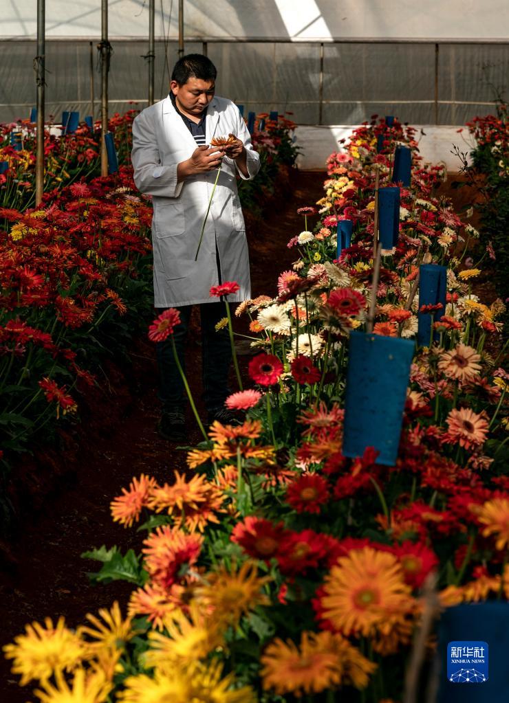 云南錦科花卉工程研究中心技術(shù)人員王江兵在觀(guān)測非洲菊新品種生長(cháng)性狀(4月3日攝)。