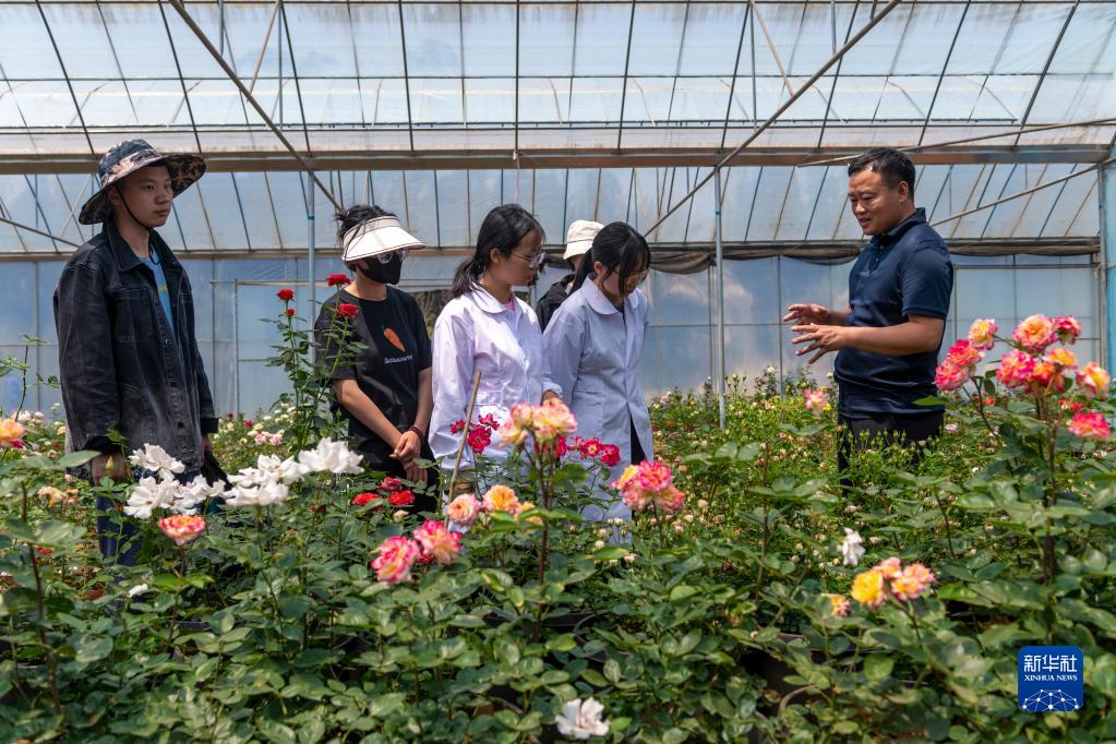 李淑斌(右)在大棚內給團隊成員講解月季育種(4月20日 攝)。