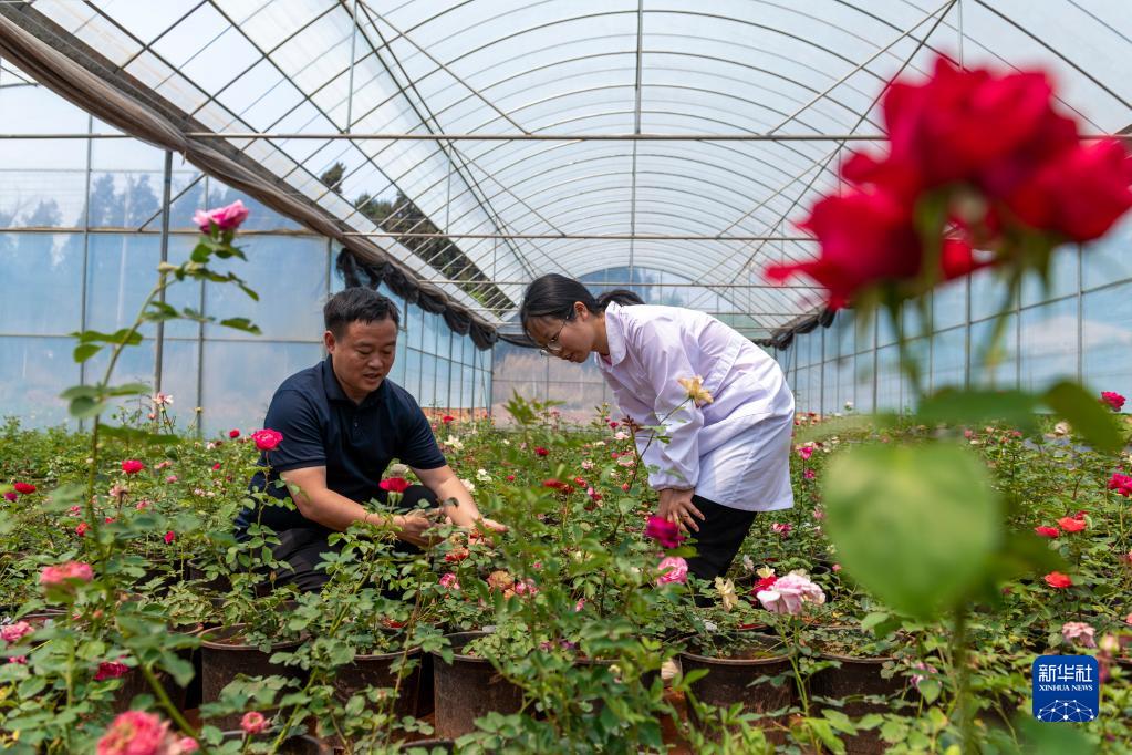李淑斌(左)和一名團隊成員在基地大棚內查看月季開(kāi)花情況(4月20日 攝)。
