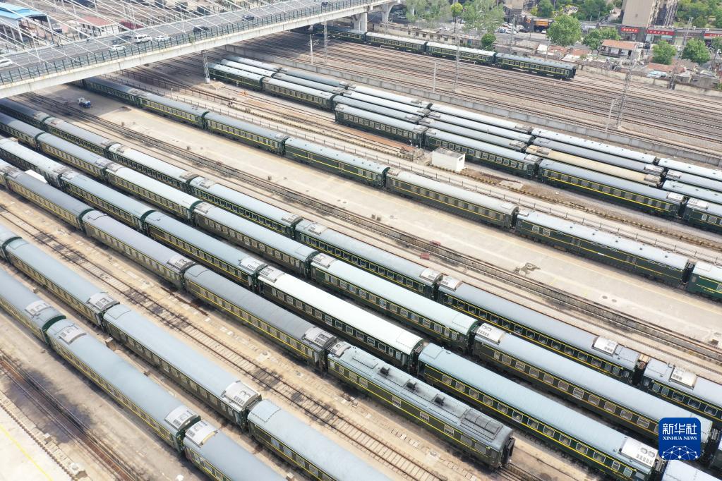 4月28日拍攝的中國鐵路上海局集團有限公司徐州站客車(chē)整備場(chǎng)內的臨時(shí)旅客列車(chē)(無(wú)人機照片)。
