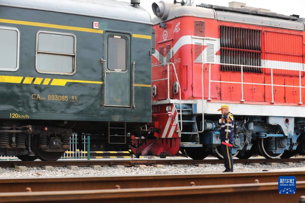 4月28日,中國鐵路上海局集團有限公司徐州站的鐵路連結員在進(jìn)行單機連掛車(chē)輛作業(yè)。