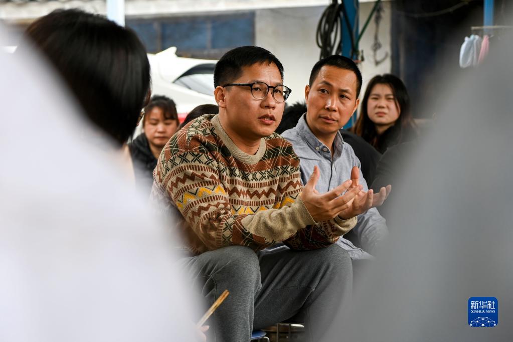何繼良(右三)與團隊的生產(chǎn)人員在廣西桂林的一處生產(chǎn)車(chē)間交流(1月11日攝)。