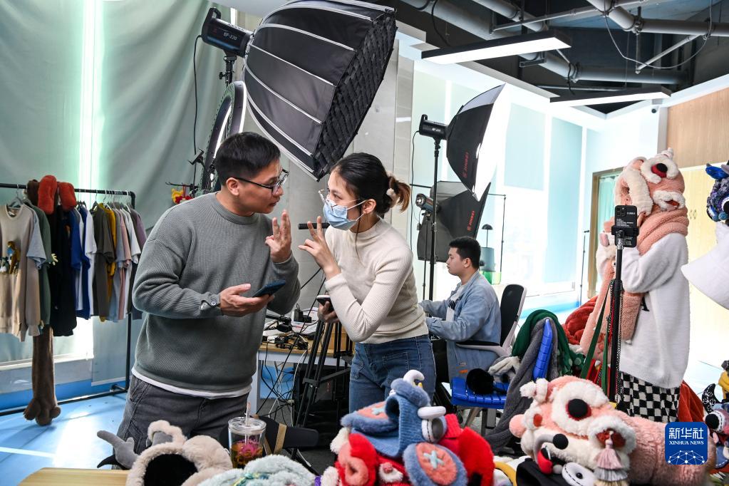 何繼良(左)在廣西桂林的工作室與直播銷(xiāo)售團隊的工作人員交流(1月10日攝)。