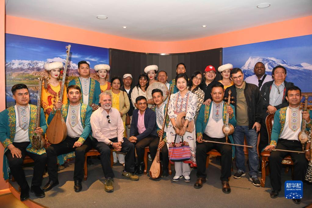 在喀什市疏附縣新疆民族樂(lè )器村,參訪(fǎng)團部分成員與當地樂(lè )隊合影留念(4月25日攝)。新華社記者 胡虎虎 攝