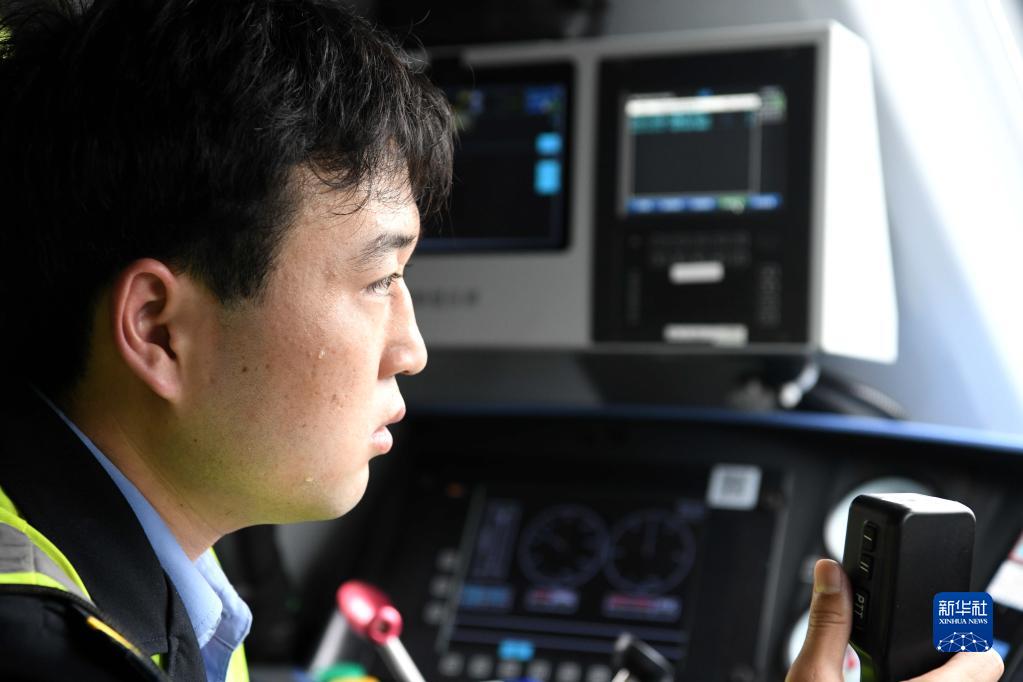 4月28日,尚志雄在值乘的中歐班列機車(chē)上。新華社記者 劉軍喜 攝