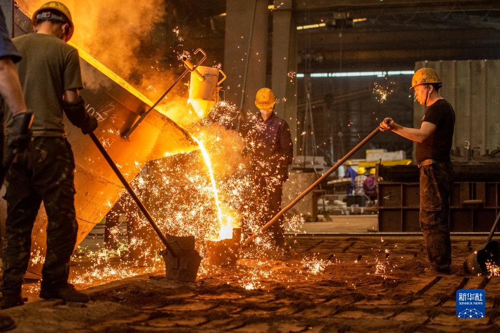 4月29日,在安徽省蕪湖市繁昌區孫村鎮的蕪湖久弘重工股份有限公司生產(chǎn)車(chē)間里,工人在砂模上澆鑄芯骨料件。