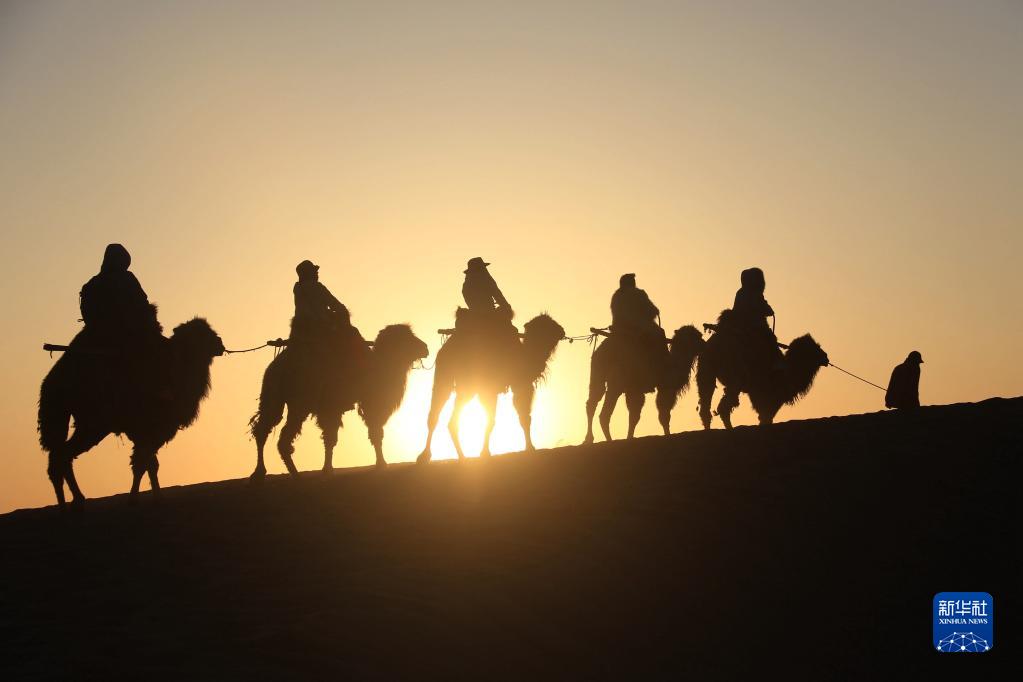 4月29日,游客在甘肅敦煌鳴沙山月牙泉景區游覽。