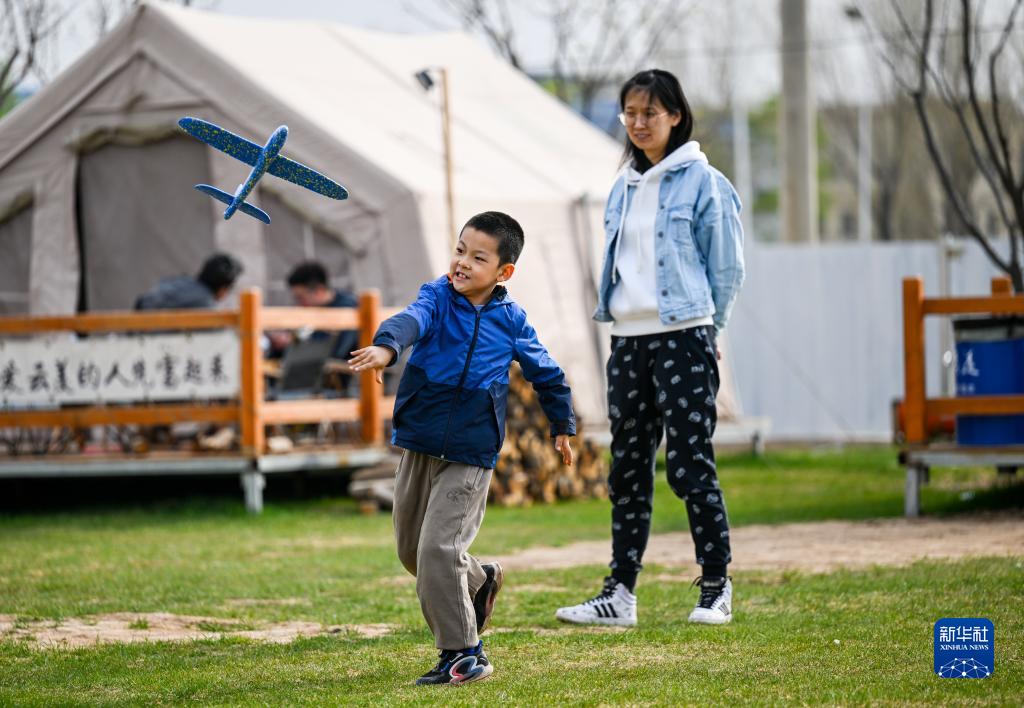 4月29日,在內蒙古呼和浩特市賽罕區的云羨露營(yíng)營(yíng)地,游人在草坪上玩耍。