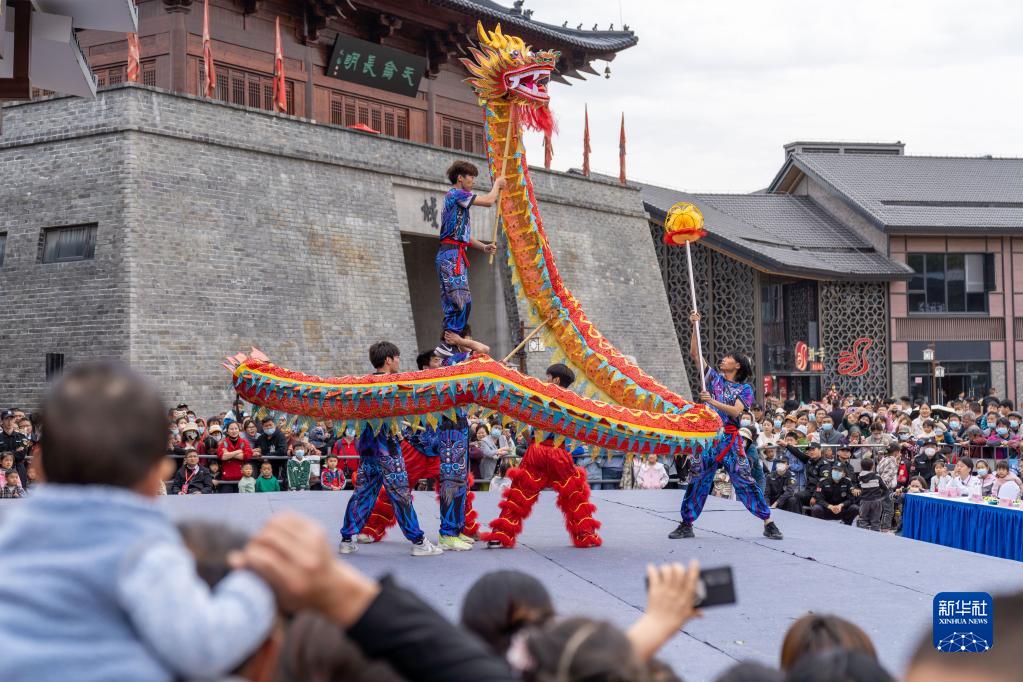 4月29日,游客在安徽省合肥市肥東縣國風(fēng)特色文化街區欣賞舞龍表演。