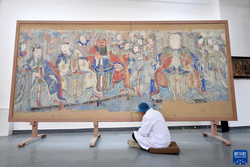 在山西省大同市云岡石窟研究院壁畫(huà)文物修復室,工作人員在修復壁畫(huà)(2021年5月9日攝)。