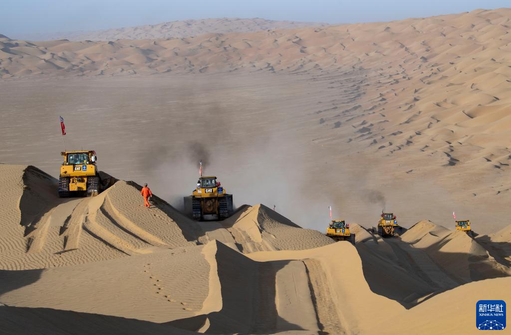 在新疆尉犁至且末沙漠公路建設現場(chǎng),工人李明友爬過(guò)沙丘觀(guān)察推土機作業(yè)進(jìn)展(2020年5月16日攝)。