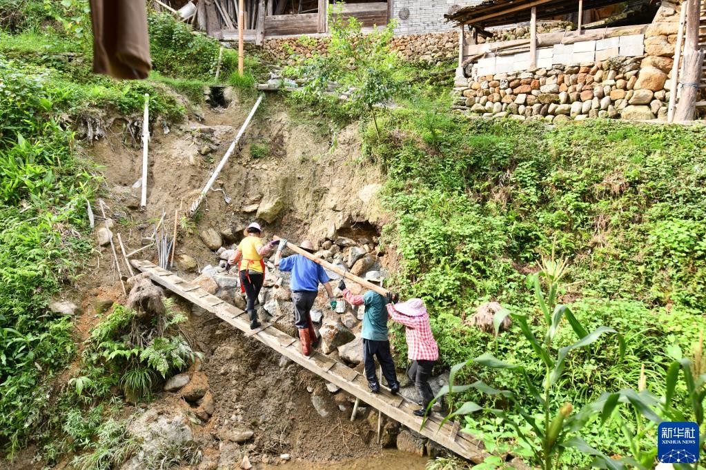 廣西融水苗族自治縣桿洞鄉烏英苗寨群眾在維修被水沖毀的路基(2022年7月21日攝)。
