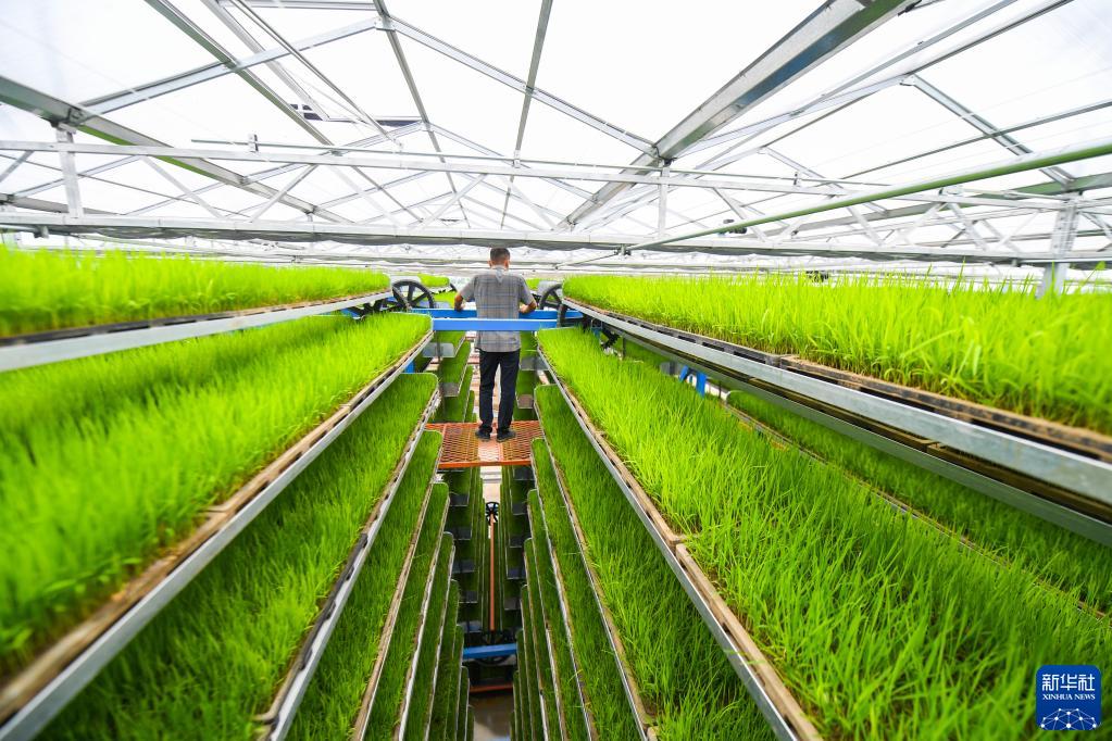 在四川省眉山市彭山區數智水稻示范基地,當地種糧大戶(hù)王程淋在查看循環(huán)式智能育秧機上的秧苗長(cháng)勢(2023年4月20日攝)。