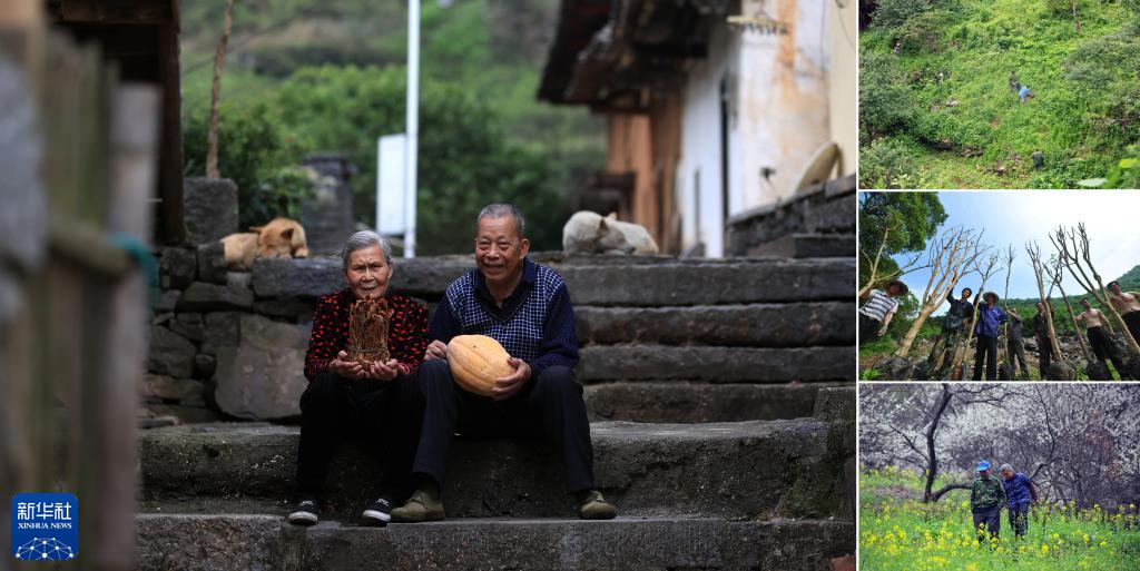 拼版照片:左圖為廣西融安縣東起鄉銅板屯81歲的老人龍耀星(右)和老伴莫杏昭(2022年3月20日攝);右上圖為龍耀星和村民在山上護理樹(shù)苗(2013年5月21日攝);右中圖為龍耀星(左三)等在山上準備種樹(shù)(2013年5月15日攝);右下圖為龍耀星和老伴莫杏昭在花叢中散步(2014年2月21日攝)。