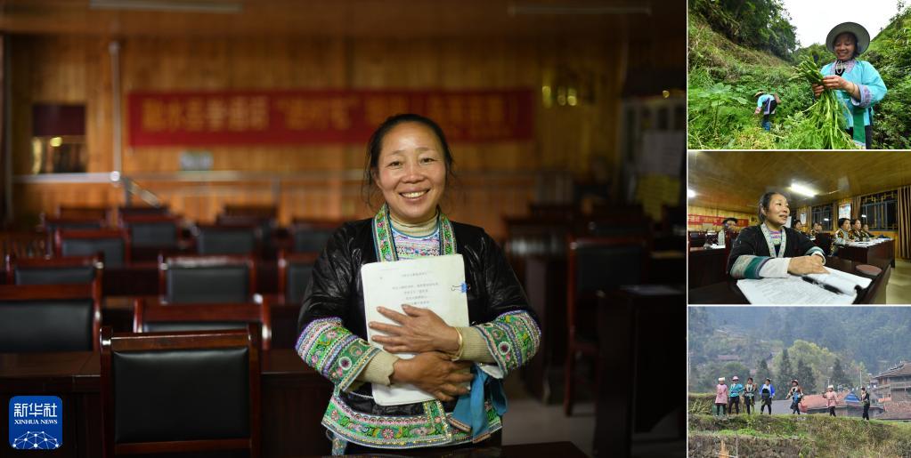 拼版照片:左圖為在廣西融水苗族自治縣桿洞鄉烏英苗寨,47歲的梁足英在夜校教室里準備上課(2023年4月25日攝);右上圖為梁足英在摘野菜,準備銷(xiāo)往縣城(2021年6月12日攝);右中圖為梁足英在夜校教室里上課(2023年3月15日攝);右下圖為梁足英(右三)和姐妹們在種樹(shù)(2023年3月16日攝)。
