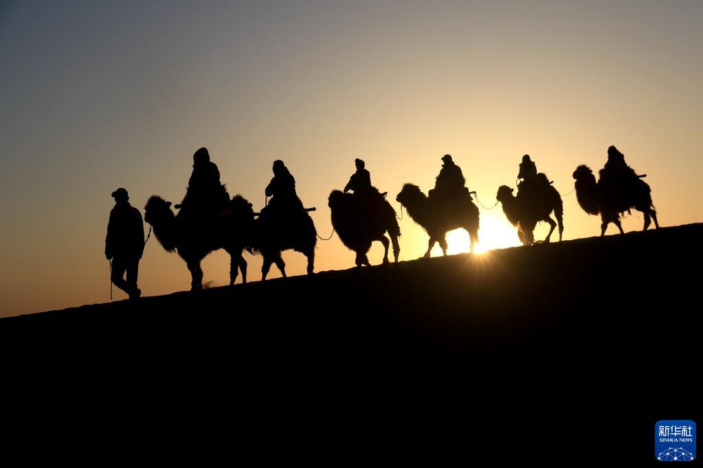 金色的鳴沙山上響起陣陣駝鈴聲,編號“414”的領(lǐng)頭駱駝和51歲的牽駝人曹文華一起帶領(lǐng)著(zhù)駝隊,馱著(zhù)游客,朝連綿起伏的沙丘深處走去。