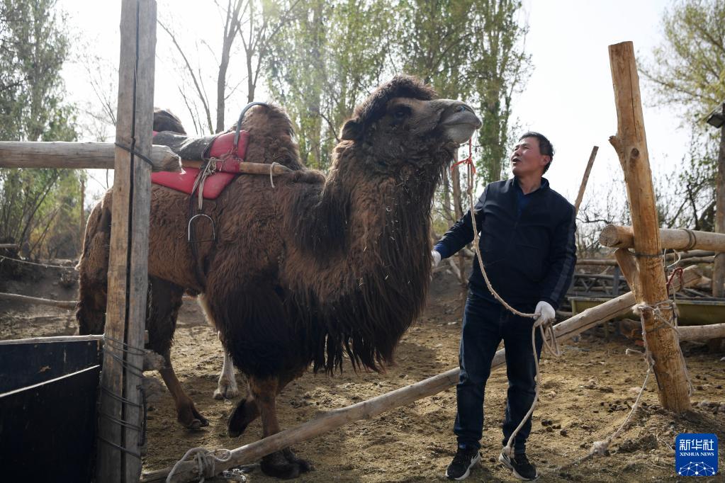 曹文華準備牽駱駝前往鳴沙山月牙泉景區(4月24日攝)。