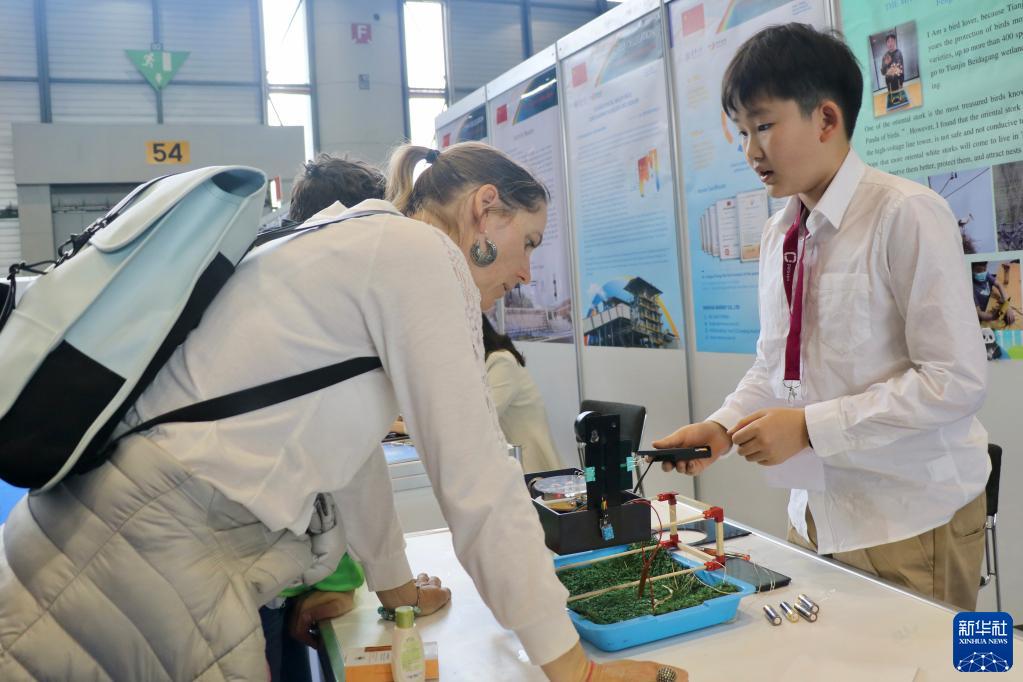 4月26日,在瑞士日內瓦舉行的第48屆日內瓦國際發(fā)明展上,中國小學(xué)生馮佳澍(右)在展會(huì )上用流利的英語(yǔ)向參觀(guān)者介紹其作品。年僅11歲的馮佳澍是展會(huì )上年齡最小的發(fā)明者,他的作品“智慧鳥(niǎo)巢”獲得金獎。