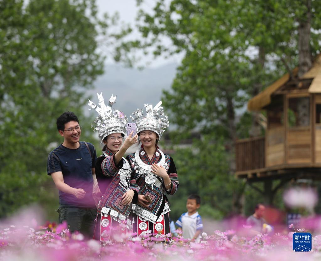 4月30日,游客穿著(zhù)苗族傳統服飾在貴州省榕江縣苗山侗水風(fēng)景區賞花游玩。