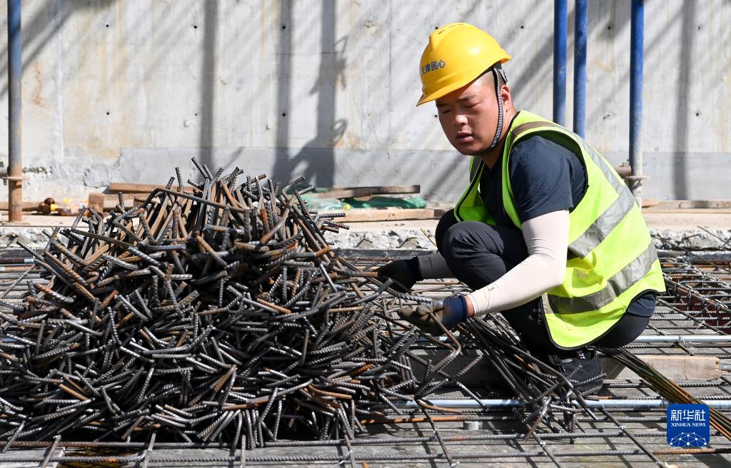 5月1日,工人在中建二局陜西分公司高鐵新城項目工地施工。