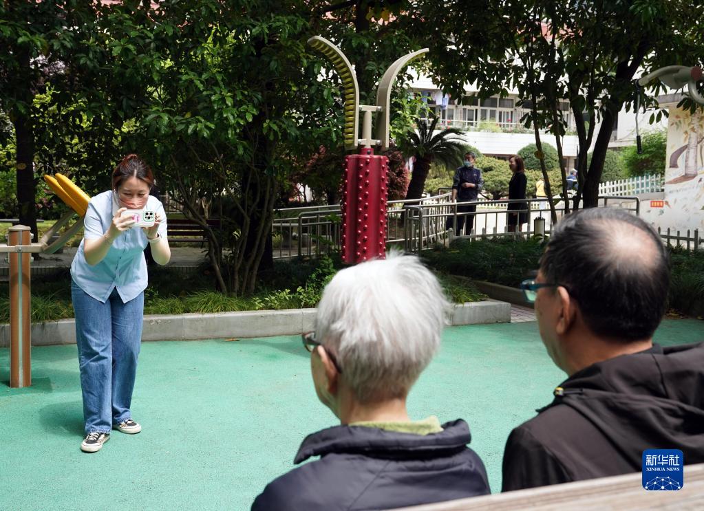 4月28日,在上海市楊浦區社會(huì )福利院,養老護理員羅鑫為老年人拍合影。