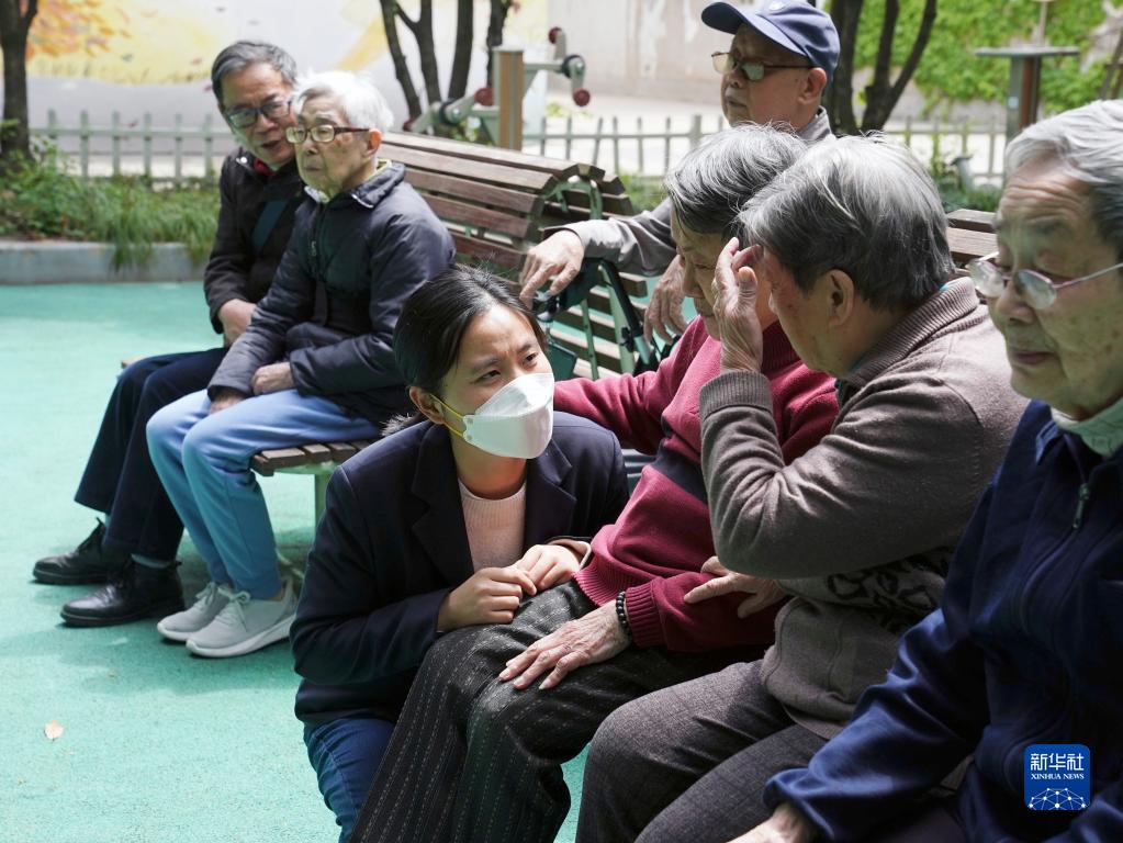 4月28日,在上海市楊浦區社會(huì )福利院,養老護理員胡小芳陪曬太陽(yáng)的老年人聊天。