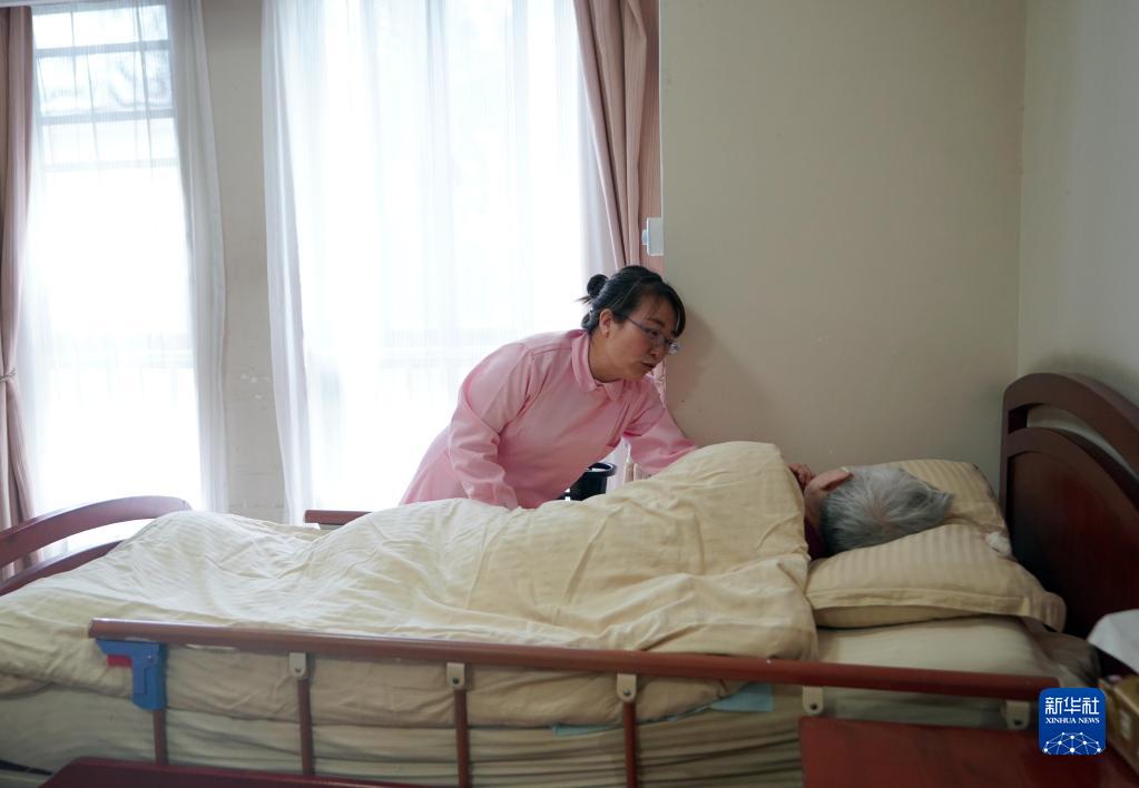 4月28日,在上海市楊浦區社會(huì )福利院,護理主管張智萍在照料臥床的老年人。