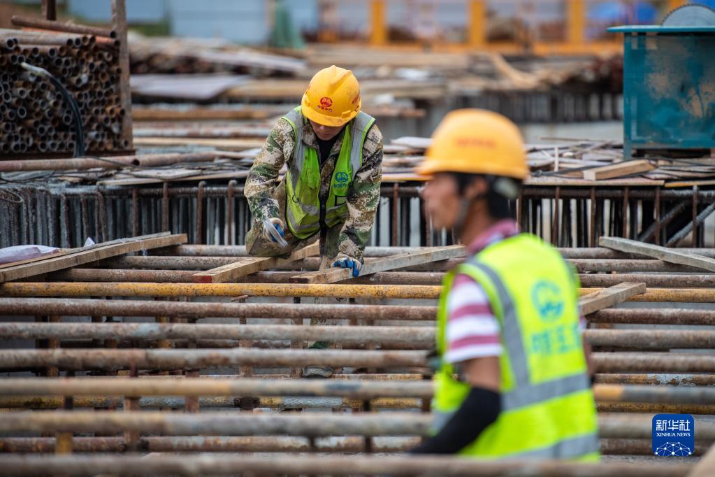 5月2日,在沅江市中心城區水環(huán)境綜合治理一期工程團山橋建設現場(chǎng),中鐵五局二公司工人在橋面上施工,為混凝土澆筑做準備。