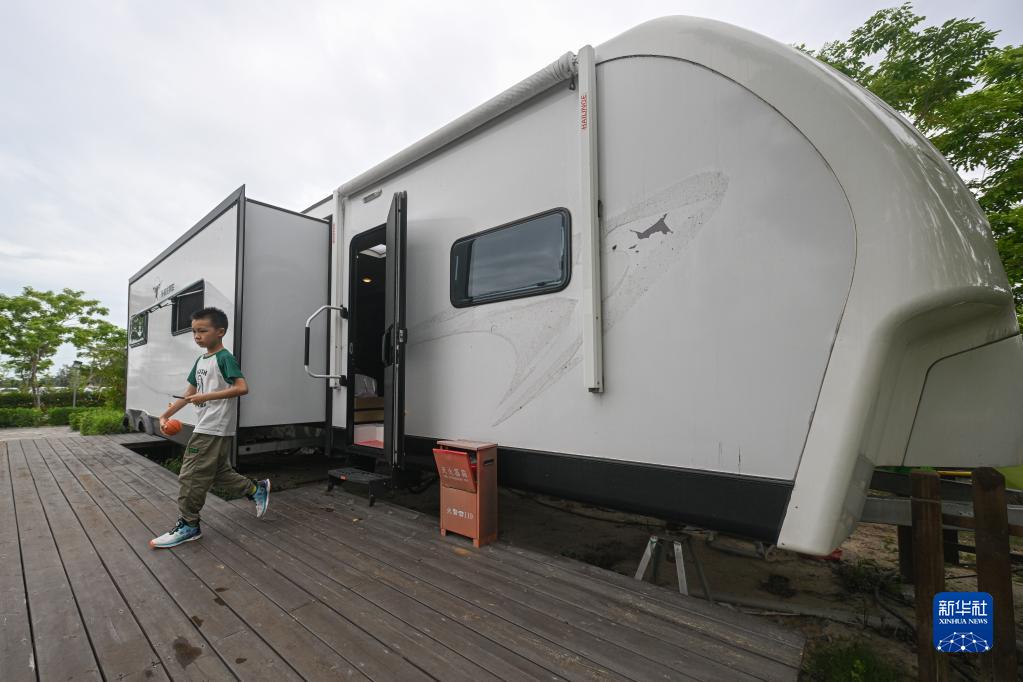 5月1日,游客在海南花梨谷文化旅游區房車(chē)庭院玩耍(無(wú)人機照片)。