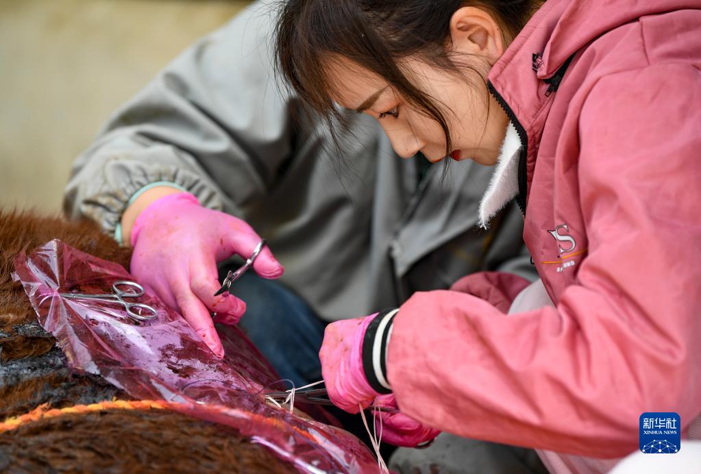 白婳在固原市原州區開(kāi)城鎮雙泉村為村民李百武的一頭??p合傷口(4月18日攝)。
