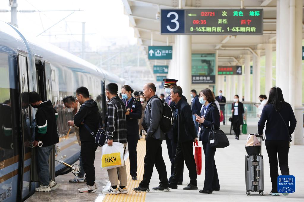 5月3日,旅客在寶蘭高鐵甘肅定西北站站臺乘車(chē)出行。