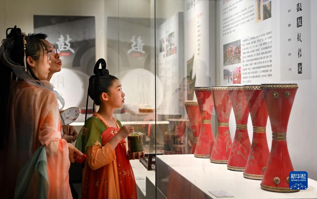 5月1日,游客在西安市鐘鼓樓博物館參觀(guān)鼓文化展。