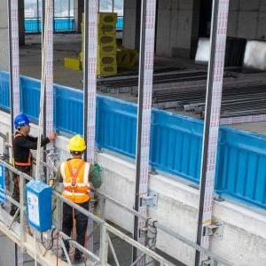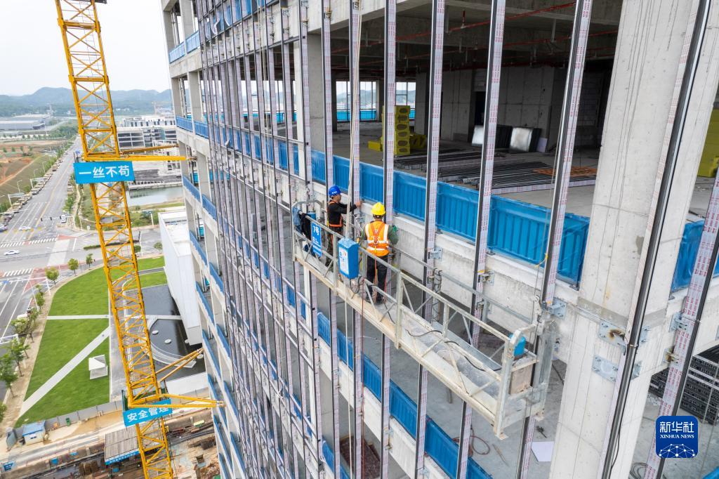 5月3日,工人在湖南長(cháng)沙智谷項目建設工地為一棟高層建筑安裝幕墻(無(wú)人機照片)。