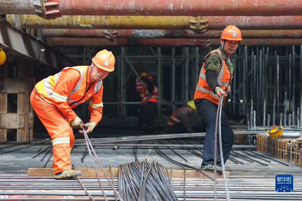 5月3日,中建八局的工人在合肥地鐵7號線(xiàn)蓮花路站工程現場(chǎng)施工。